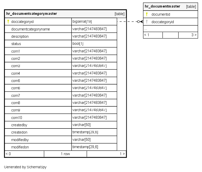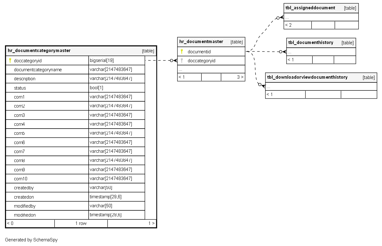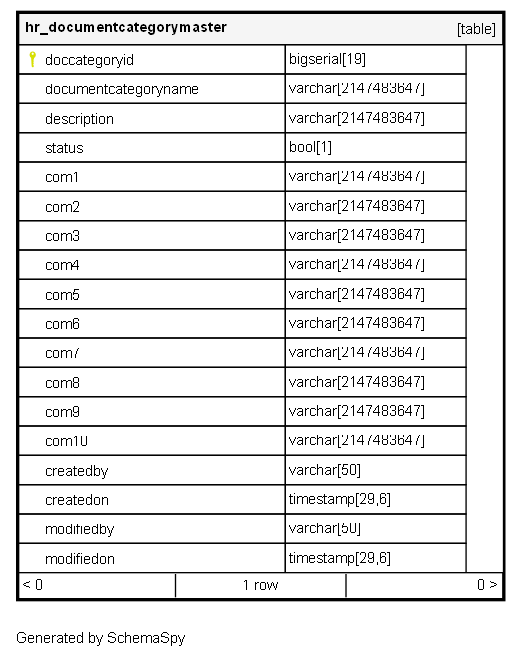 | hr_documentcategorymaster_pk_hr_documentcategorymaster | Primary key | Asc | doccategoryid |