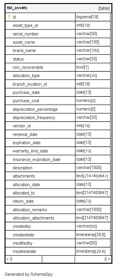 | id | bigserial | 19 | √ | nextval('tbl_assets_id_seq'::regclass) |