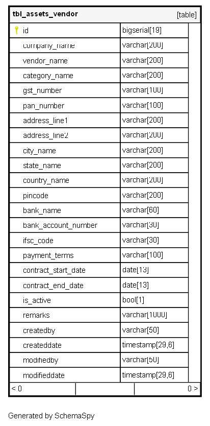 | pk_tbl_assets_vendor | Primary key | Asc | id |