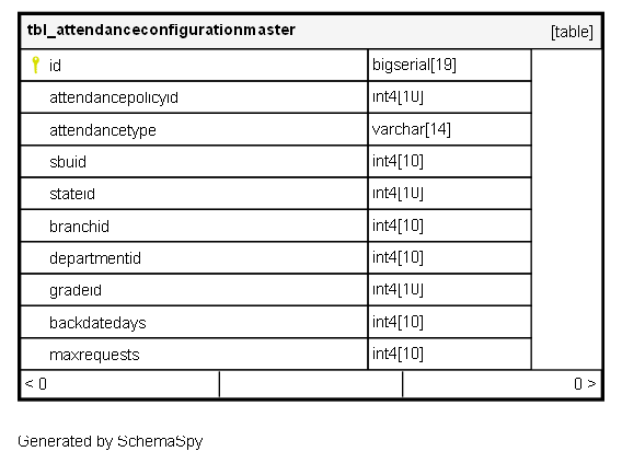 | id | bigserial | 19 | √ | nextval('tbl_attendanceconfigurationmaster_id_seq'::regclass) |