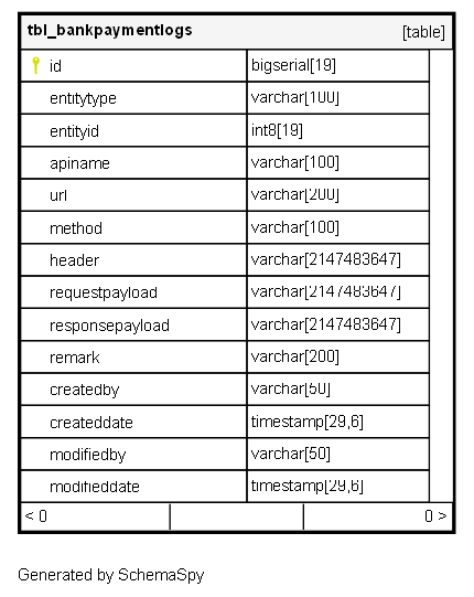| id | bigserial | 19 | √ | nextval('tbl_bankpaymentlogs_id_seq'::regclass) |