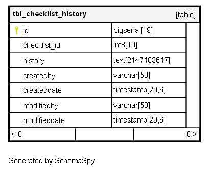 | id | bigserial | 19 | √ | nextval('tbl_checklist_history_id_seq'::regclass) |