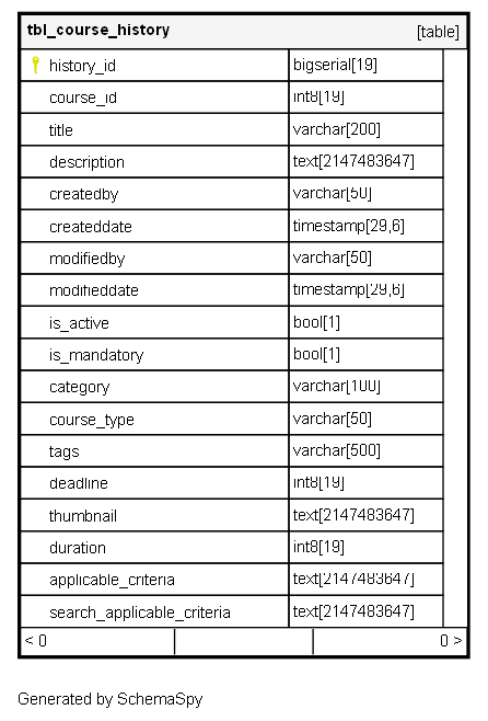 | history_id | bigserial | 19 | √ | nextval('tbl_course_history_history_id_seq'::regclass) |