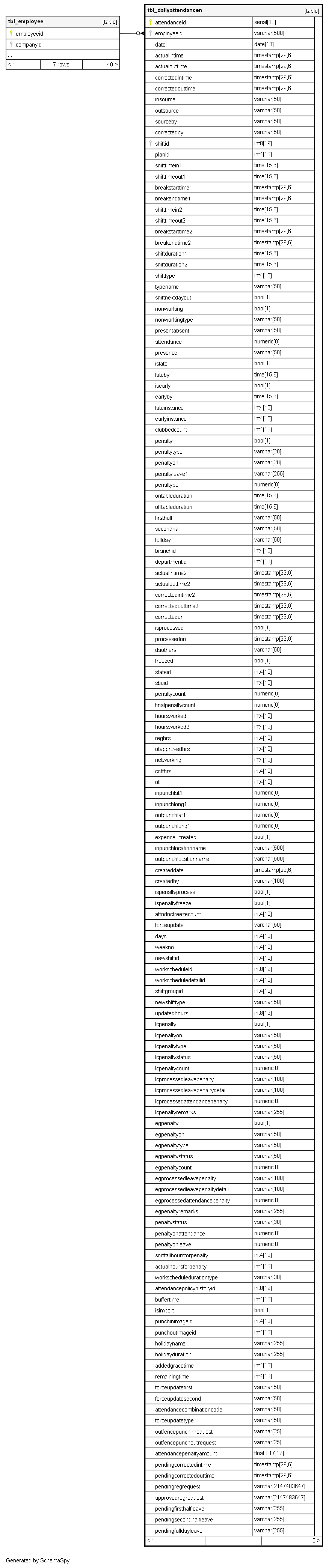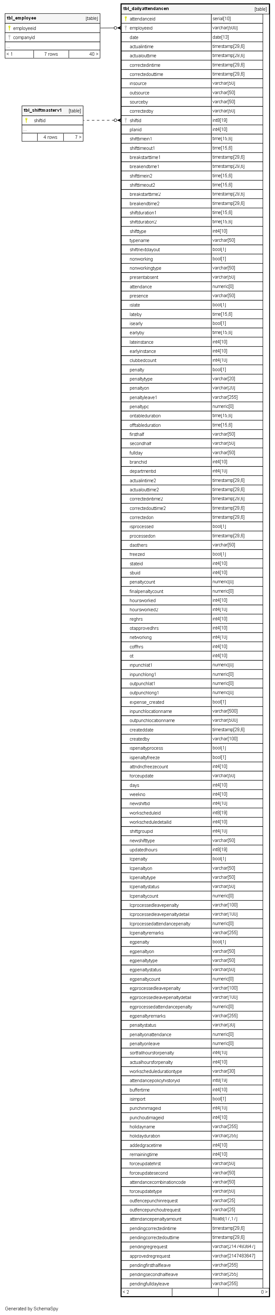 | tbl_dailyattendancen_idx_employee_tbl_dailyattendancen | Performance | Asc | employeeid |