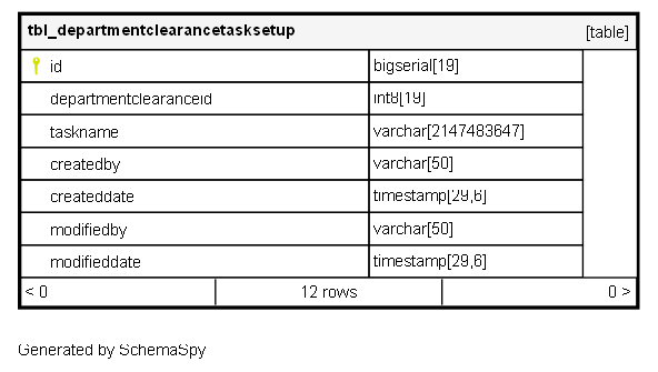 | id | bigserial | 19 | √ | nextval('tbl_departmentclearancetasksetup_id_seq'::regclass) |
