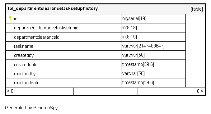 | tbl_departmentclearancetasksetuphistory_pk__tbl_depa__3214ec071 | Primary key | Asc | id |