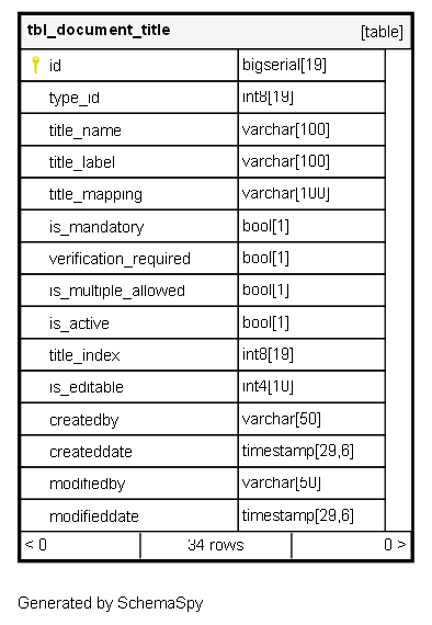 | id | bigserial | 19 | √ | nextval('tbl_document_title_id_seq'::regclass) |