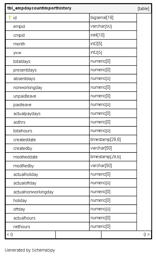 | id | bigserial | 19 | √ | nextval('tbl_empdaycountimporthistory_id_seq'::regclass) |