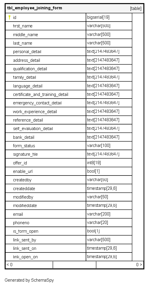 | id | bigserial | 19 | √ | nextval('tbl_employee_joining_form_id_seq'::regclass) |
