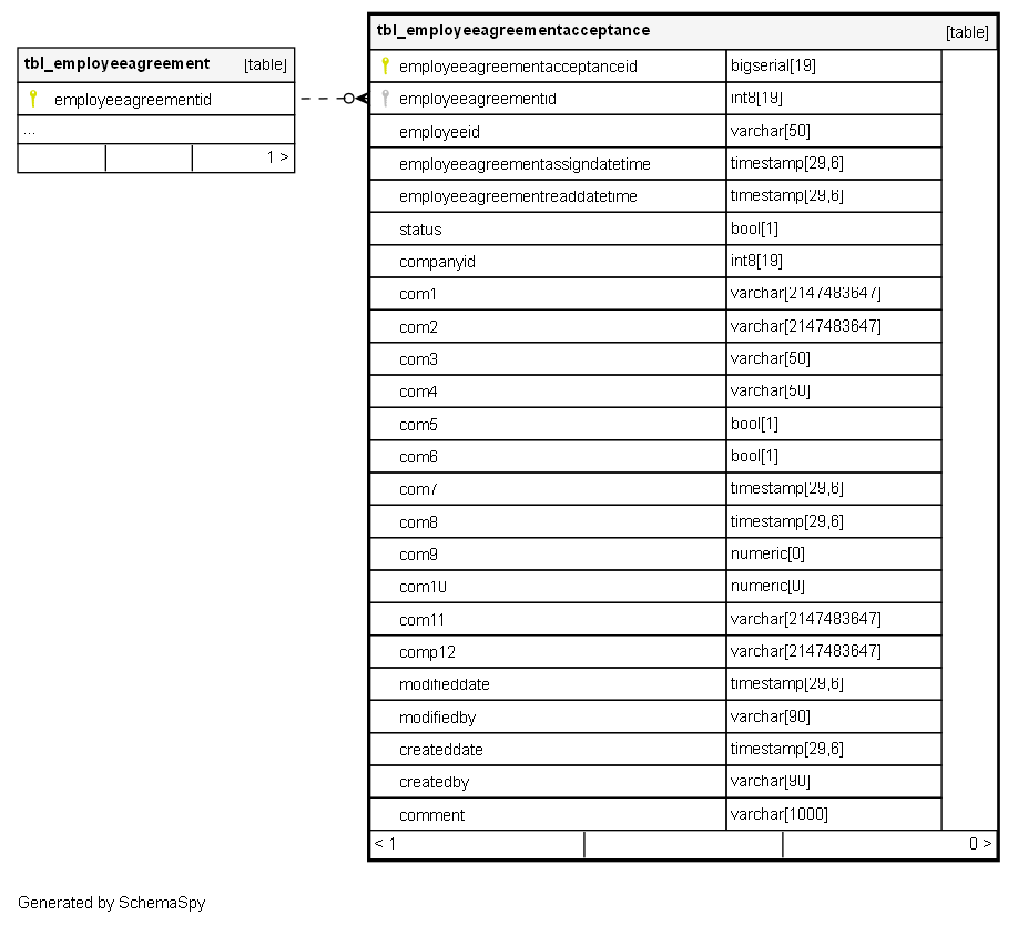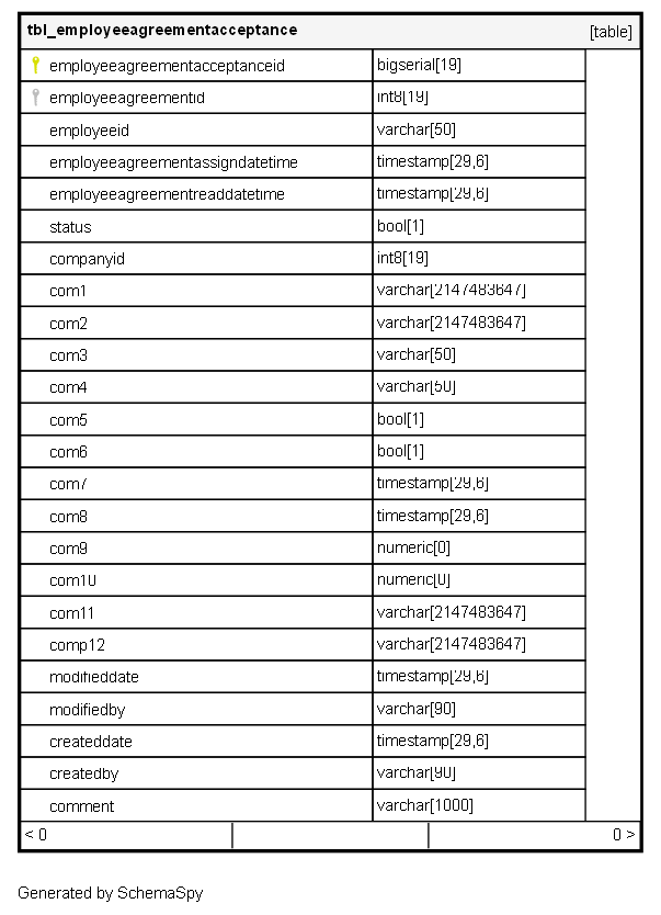 | employeeagreementacceptanceid | bigserial | 19 | √ | nextval('tbl_employeeagreementacceptan_employeeagreementacceptanceid_seq'::regclass) |