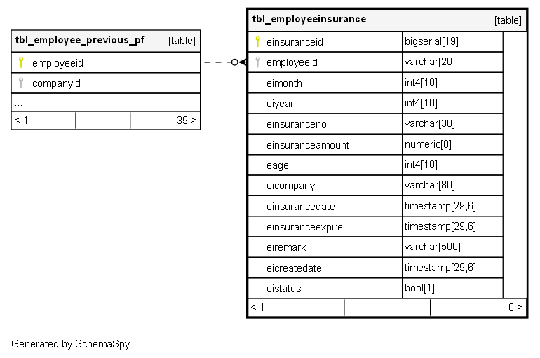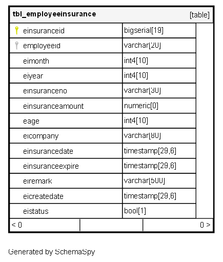 | einsuranceid | bigserial | 19 | √ | nextval('tbl_employeeinsurance_einsuranceid_seq'::regclass) |