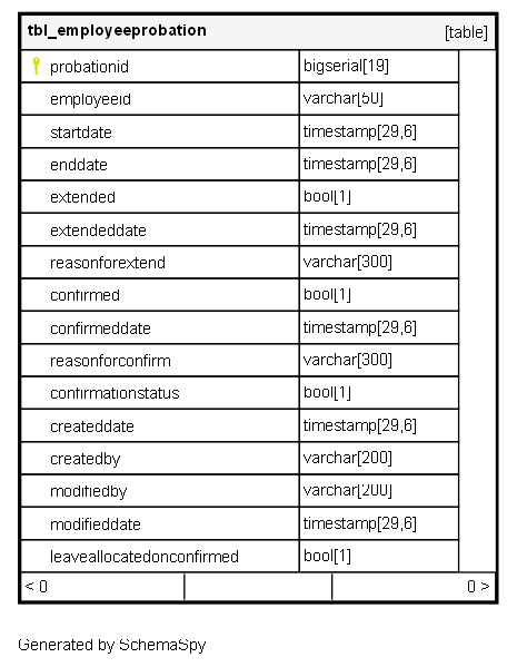 | tbl_employeeprobation_pk_tbl_employeeprobation | Primary key | Asc | probationid |