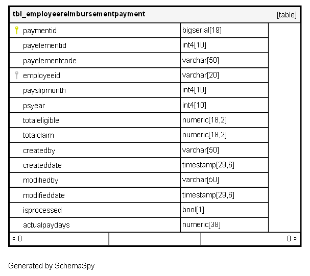 | paymentid | bigserial | 19 | √ | nextval('tbl_employeereimbursementpayment_paymentid_seq'::regclass) |