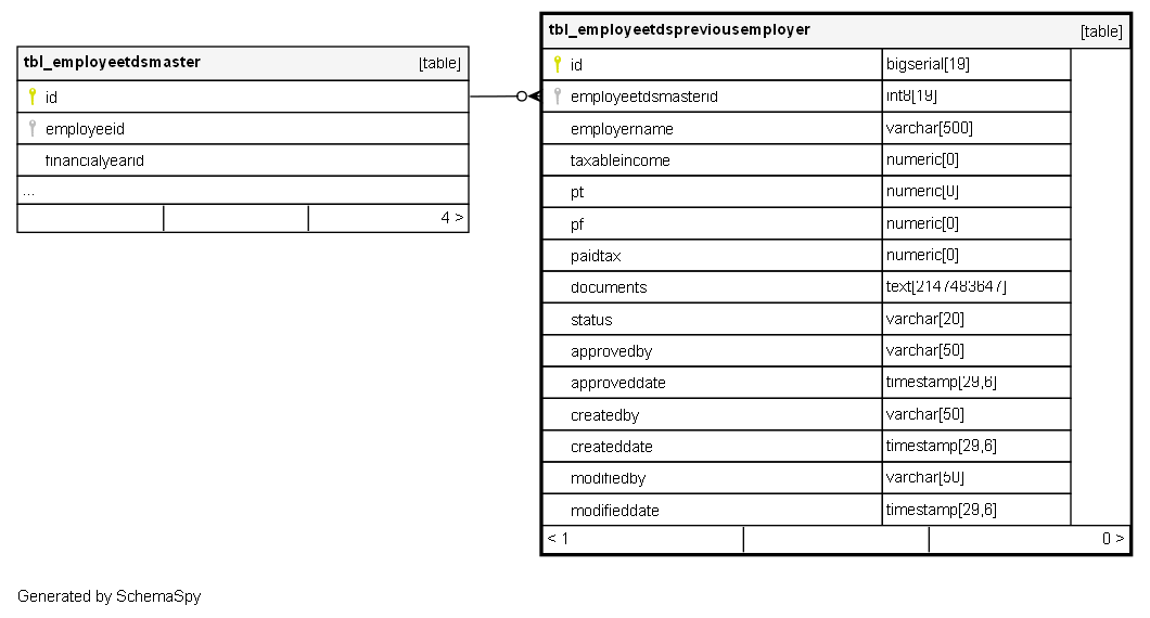 | id | bigserial | 19 | √ | nextval('tbl_employeetdspreviousemployer_id_seq'::regclass) |