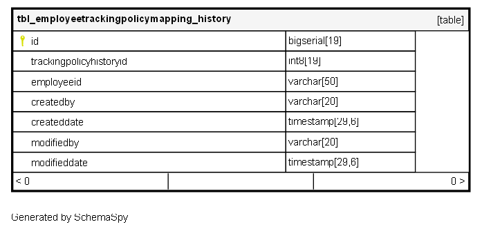 | id | bigserial | 19 | √ | nextval('tbl_employeetrackingpolicymapping_history_id_seq'::regclass) |