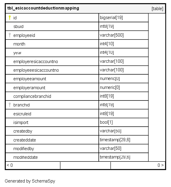 | id | bigserial | 19 | √ | nextval('tbl_esicaccountdeductionmapping_id_seq'::regclass) |