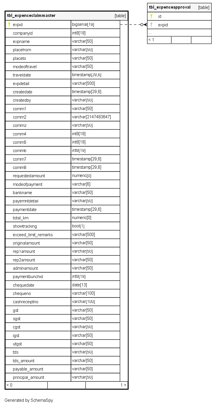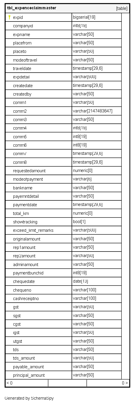 | expid | bigserial | 19 | √ | nextval('tbl_expenceclaimmaster_expid_seq'::regclass) |