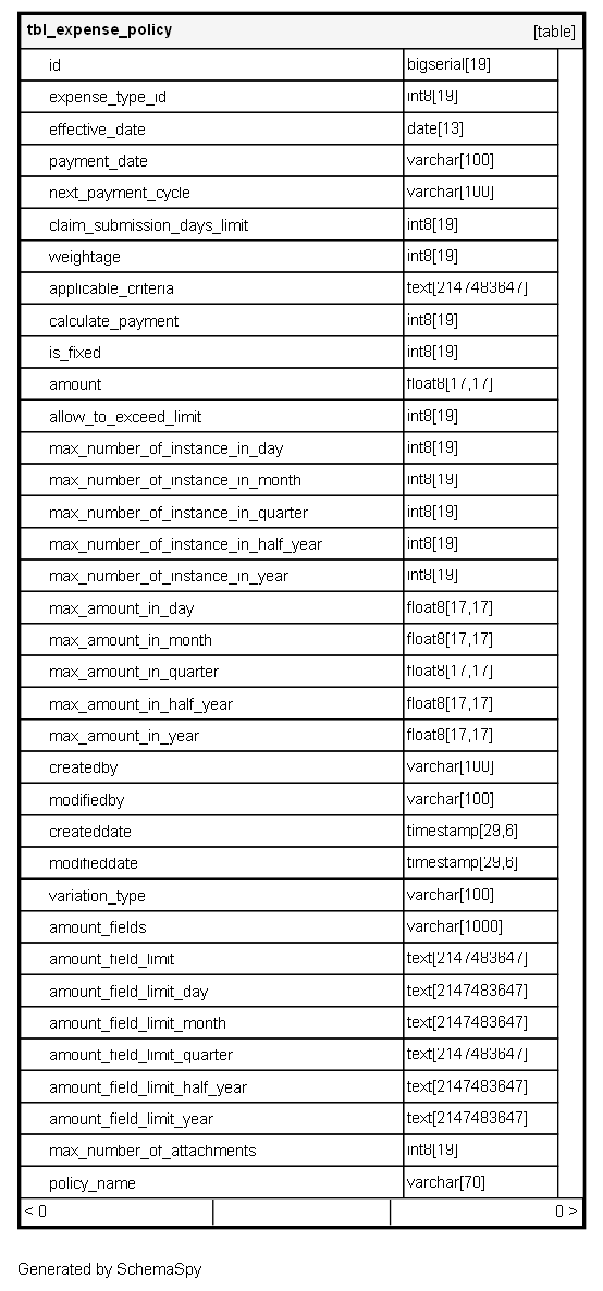 | id | bigserial | 19 | √ | nextval('tbl_expense_policy_id_seq'::regclass) |