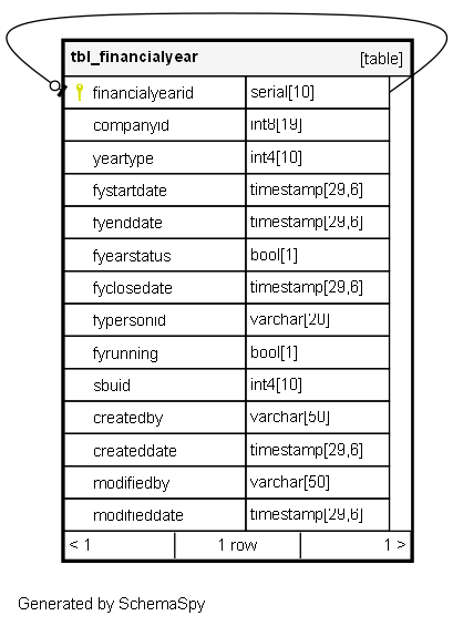 | tbl_financialyear_pk_tbl_financialyear | Primary key | Asc | financialyearid |