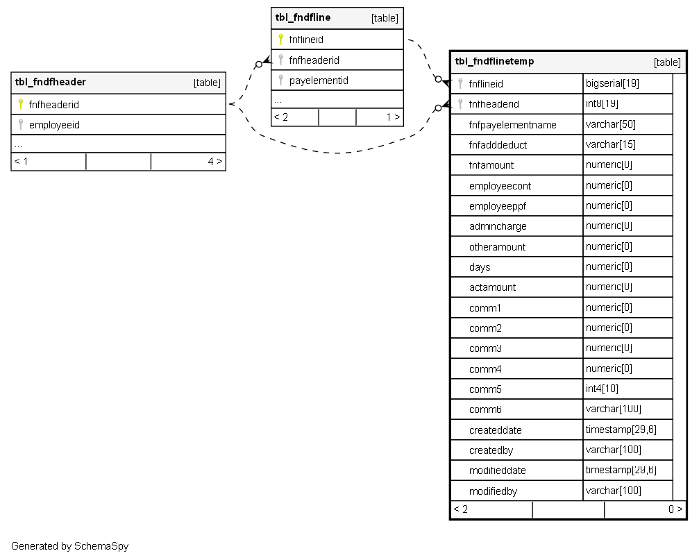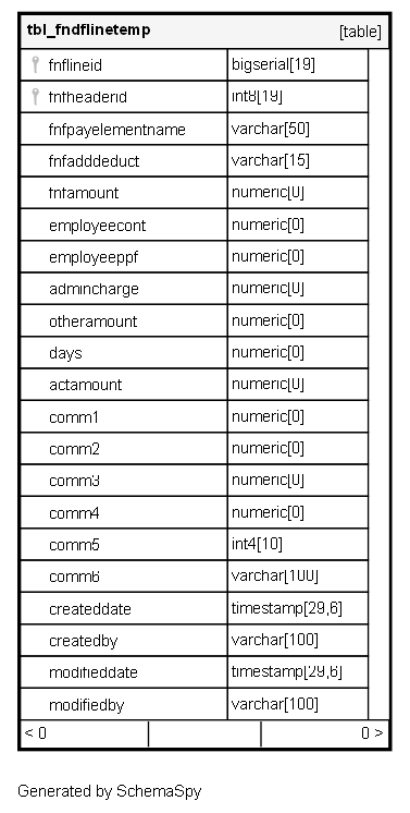 | fnflineid | bigserial | 19 | √ | nextval('tbl_fndflinetemp_fnflineid_seq'::regclass) |