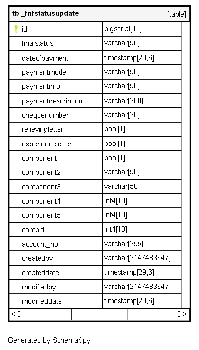| id | bigserial | 19 | √ | nextval('tbl_fnfstatusupdate_id_seq'::regclass) |