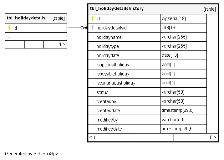 | id | bigserial | 19 | √ | nextval('tbl_holidaydetailshistory_id_seq'::regclass) |