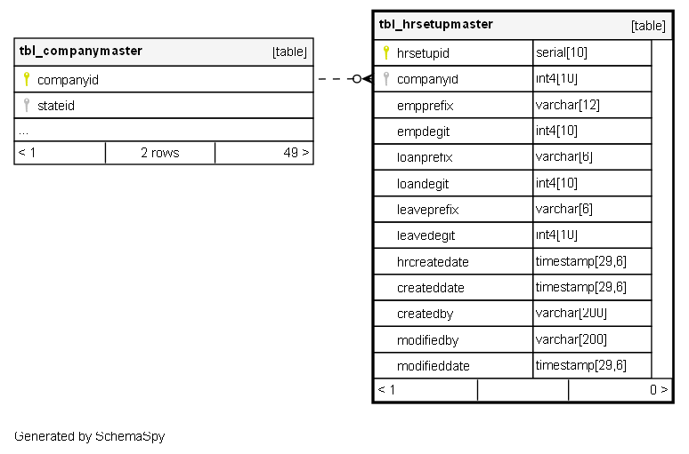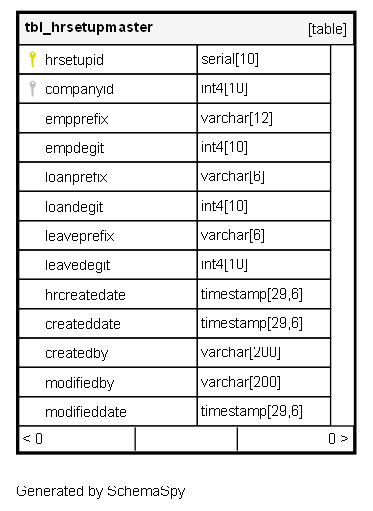 | hrsetupid | serial | 10 | √ | nextval('tbl_hrsetupmaster_hrsetupid_seq'::regclass) |