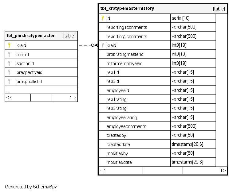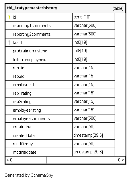 | id | serial | 10 | √ | nextval('tbl_kratypemasterhistory_id_seq'::regclass) |
