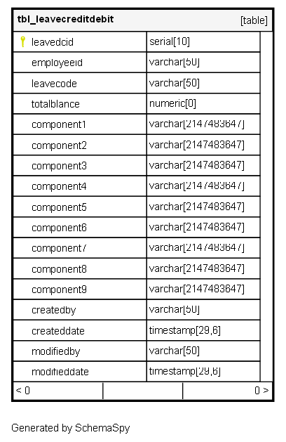| leavedcid | serial | 10 | √ | nextval('tbl_leavecreditdebit_leavedcid_seq'::regclass) |