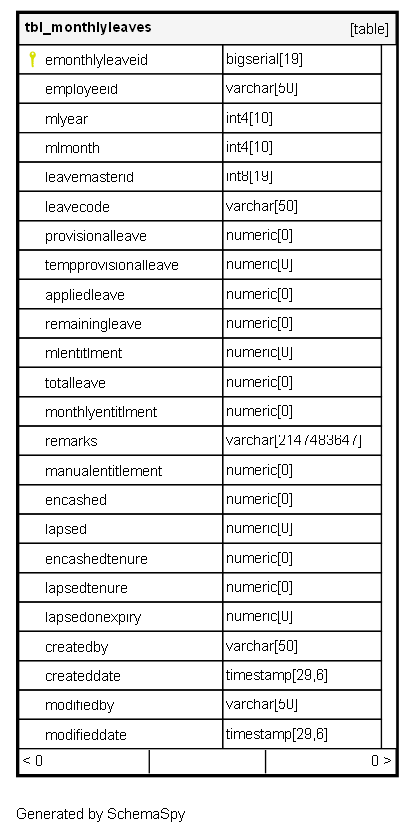 | emonthlyleaveid | bigserial | 19 | √ | nextval('tbl_monthlyleaves_emonthlyleaveid_seq'::regclass) |