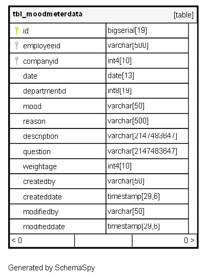 | id | bigserial | 19 | √ | nextval('tbl_moodmeterdata_id_seq'::regclass) |