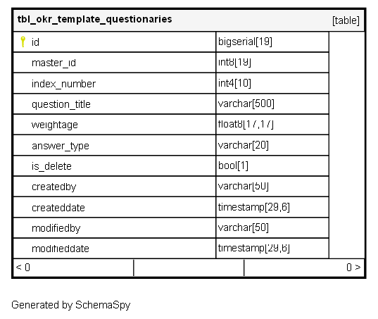 | id | bigserial | 19 | √ | nextval('tbl_okr_template_questionaries_id_seq'::regclass) |