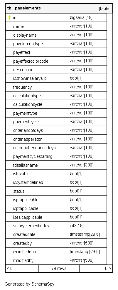 | tbl_payelements_pk__tbl__payelements | Primary key | Asc | id |