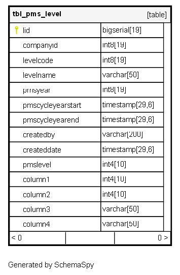 | lid | bigserial | 19 | √ | nextval('tbl_pms_level_lid_seq'::regclass) |