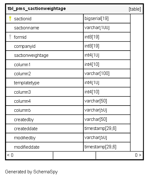 | sactionid | bigserial | 19 | √ | nextval('tbl_pms_sactionweightage_sactionid_seq'::regclass) |