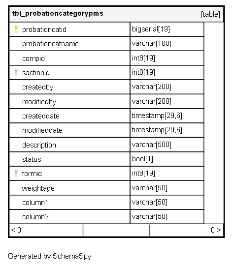 | tbl_probationcategorypms_pk_tbl_probationcategorypms | Primary key | Asc | probationcatid |