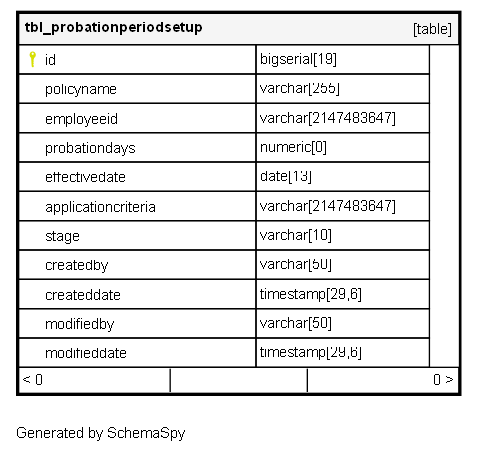 | id | bigserial | 19 | √ | nextval('tbl_probationperiodsetup_id_seq'::regclass) |