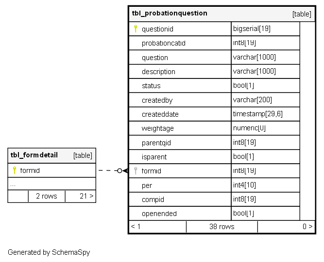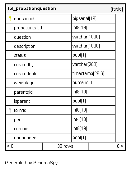| questionid | bigserial | 19 | √ | nextval('tbl_probationquestion_questionid_seq'::regclass) |
