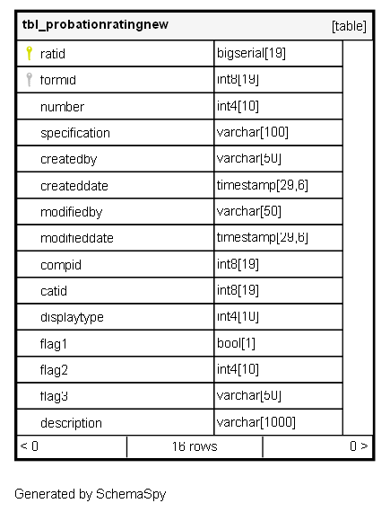 | ratid | bigserial | 19 | √ | nextval('tbl_probationratingnew_ratid_seq'::regclass) |