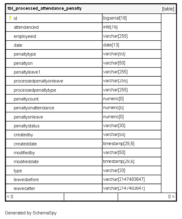 | id | bigserial | 19 | √ | nextval('tbl_processed_attendance_penalty_id_seq'::regclass) |