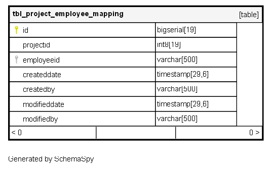 | id | bigserial | 19 | √ | nextval('tbl_project_employee_mapping_id_seq'::regclass) |
