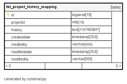 | id | bigserial | 19 | √ | nextval('tbl_project_history_mapping_id_seq'::regclass) |
