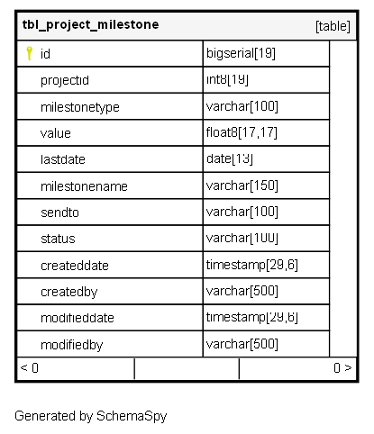 | id | bigserial | 19 | √ | nextval('tbl_project_milestone_id_seq'::regclass) |