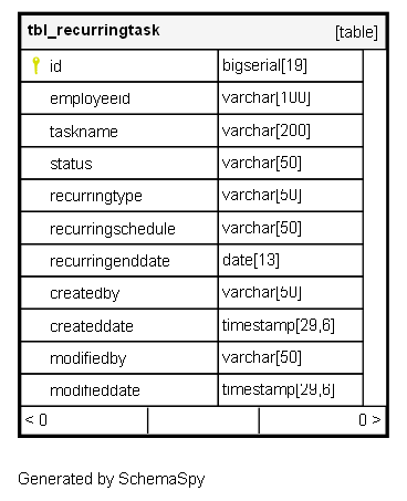 | id | bigserial | 19 | √ | nextval('tbl_recurringtask_id_seq'::regclass) |