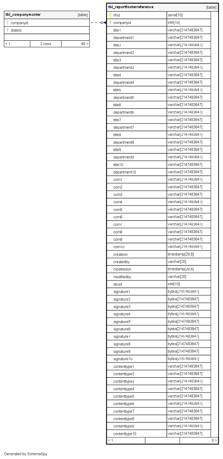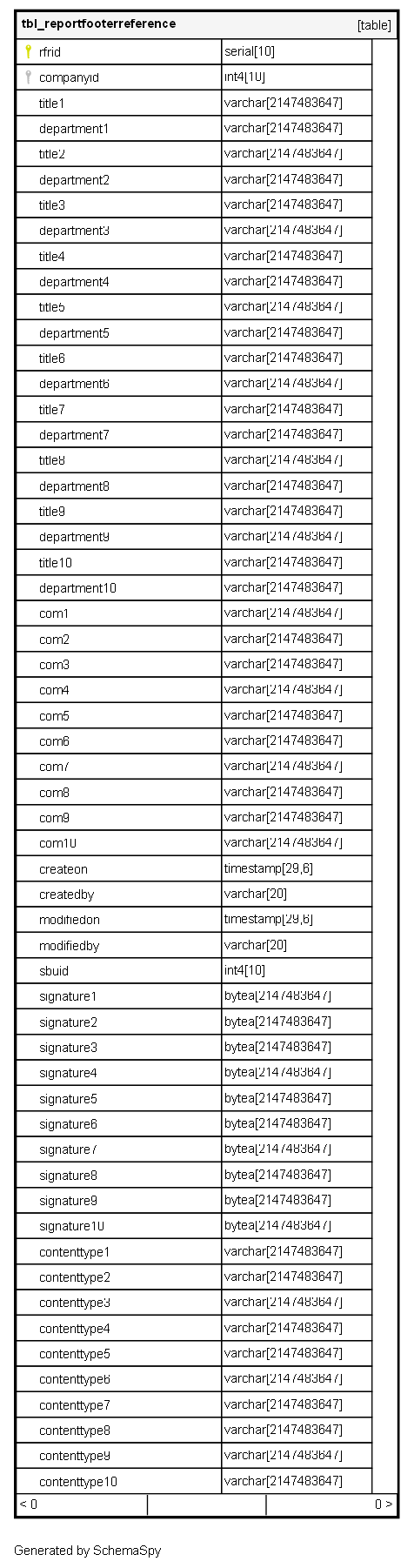 | rfrid | serial | 10 | √ | nextval('tbl_reportfooterreference_rfrid_seq'::regclass) |