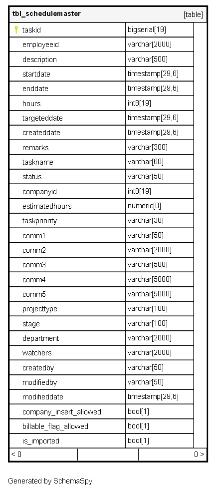 | taskid | bigserial | 19 | √ | nextval('tbl_schedulemaster_taskid_seq'::regclass) |