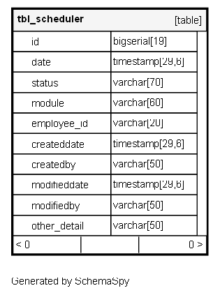 | id | bigserial | 19 | √ | nextval('tbl_scheduler_id_seq'::regclass) |