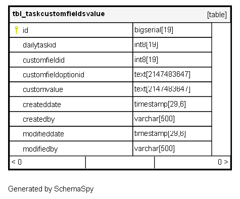 | id | bigserial | 19 | √ | nextval('tbl_taskcustomfieldsvalue_id_seq'::regclass) |