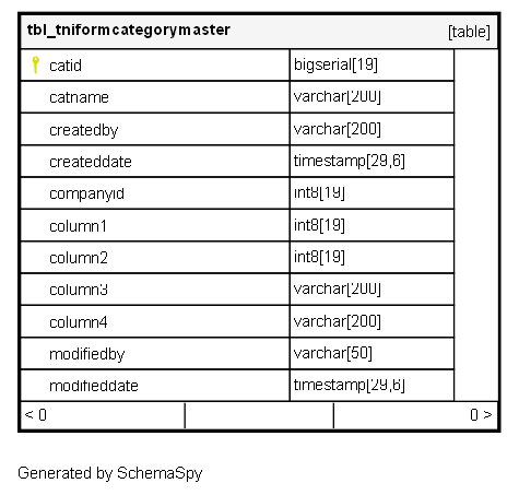 | catid | bigserial | 19 | √ | nextval('tbl_tniformcategorymaster_catid_seq'::regclass) |
