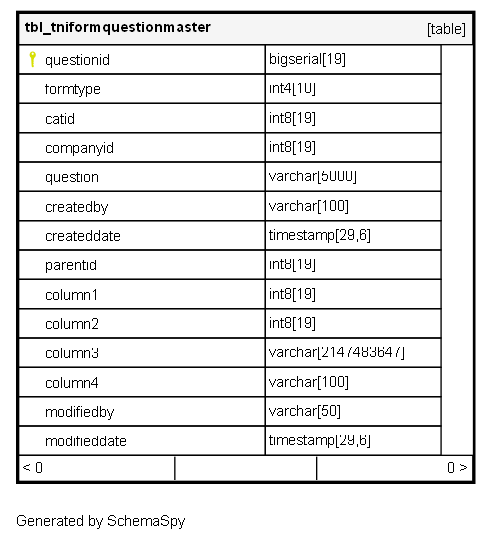 | questionid | bigserial | 19 | √ | nextval('tbl_tniformquestionmaster_questionid_seq'::regclass) |